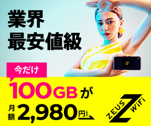 | ZEUS WiFi 縛りなし 100GB | 100GB | 1ヶ月 | H01 | 3,300円 | 4,708円 | 440円 |